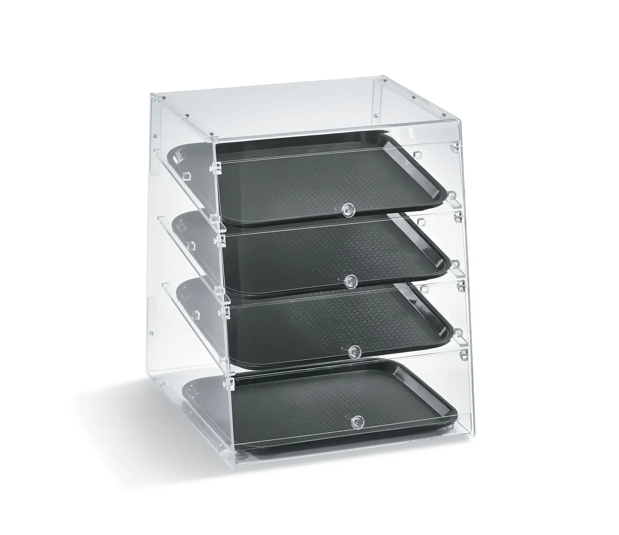 The 4-tier knockdown baked goods display case by Vollrath displays your baked goods beautifully. Made of clear acrylic, this countertop case assembles in minutes and ensures great product visibility. Each of the four tiers has a black tray and a self-closing door, which allows easy access while acting as a sneeze guard to maintain sanitation. With the front doors providing self-serve convenience, this display case is the ideal choice for your baked goods display.