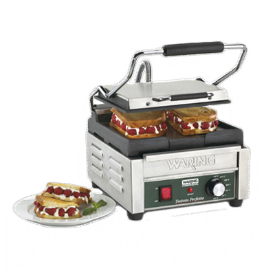 Streamline your restaurant cooking operations with the Waring WFG150 Sandwich/Panini Grill. This compact toasting grill is perfect for commercial use, offering a 9-1/4" x 9-3/4" cooking surface that can handle a variety of sandwiches and paninis. The hinged auto-balancing top plate with heat resistant handles ensures even cooking and easy operation. The flat cast iron plates provide excellent heat distribution and retention, while the adjustable thermostats allow you to achieve the perfect temperature up to 570 F (300 C). With indicator lights and a brushed stainless steel body, this grill is not only functional but also visually appealing. The removable drip tray makes cleaning a breeze, and the UL and NSF certifications guarantee its safety and quality. Upgrade your restaurant kitchen with the Waring WFG150 Sandwich/Panini Grill and enjoy efficient and delicious cooking every time.