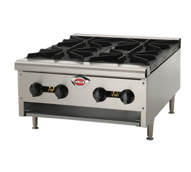 Experience kitchen innovation with the Wells HDHP-2430G Hotplate. This countertop gas hotplate is designed to meet the demands of a commercial restaurant kitchen. With four powerful 26,000 BTU burners, this hotplate delivers exceptional cooking performance. The cast iron grates provide even heat distribution, ensuring that your dishes are cooked to perfection every time. The stainless steel housing not only adds durability but also gives the hotplate a sleek and professional look. Each burner has individual controls, allowing you to easily adjust the heat according to your cooking needs. The full-width drip tray collects any excess grease or food particles, making cleanup a breeze. The 4" adjustable legs ensure stability and allow for easy installation. With a total output of 106,000 BTU, this hotplate is NSF and cULus certified, guaranteeing its safety and quality. Upgrade your kitchen with the Wells HDHP-2430G Hotplate and experience the difference in performance and efficiency.